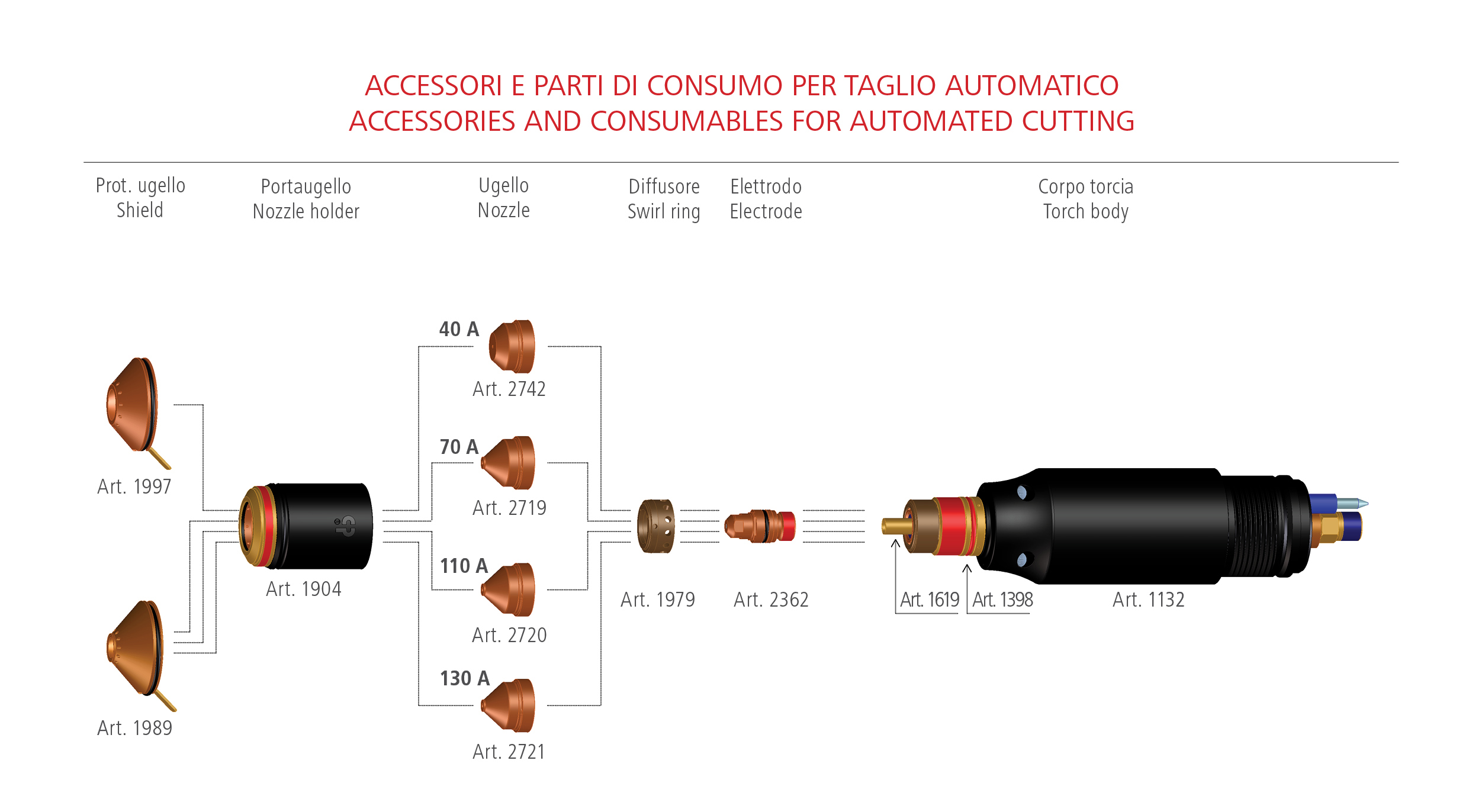The registered trademark CP identifies Cebora original consumables for plasma power sources.Cebora strongly recommends the use of original CP consumables, as they are the only parts capable of guaranteeing the expected power source-torch combination performance. The geometry and materials chosen for CP consumables are decided when the power source and the torch are designed, and represent the best compromise between part performance, reliability and lifetime, in compliance with IEC 60974-7 standards.